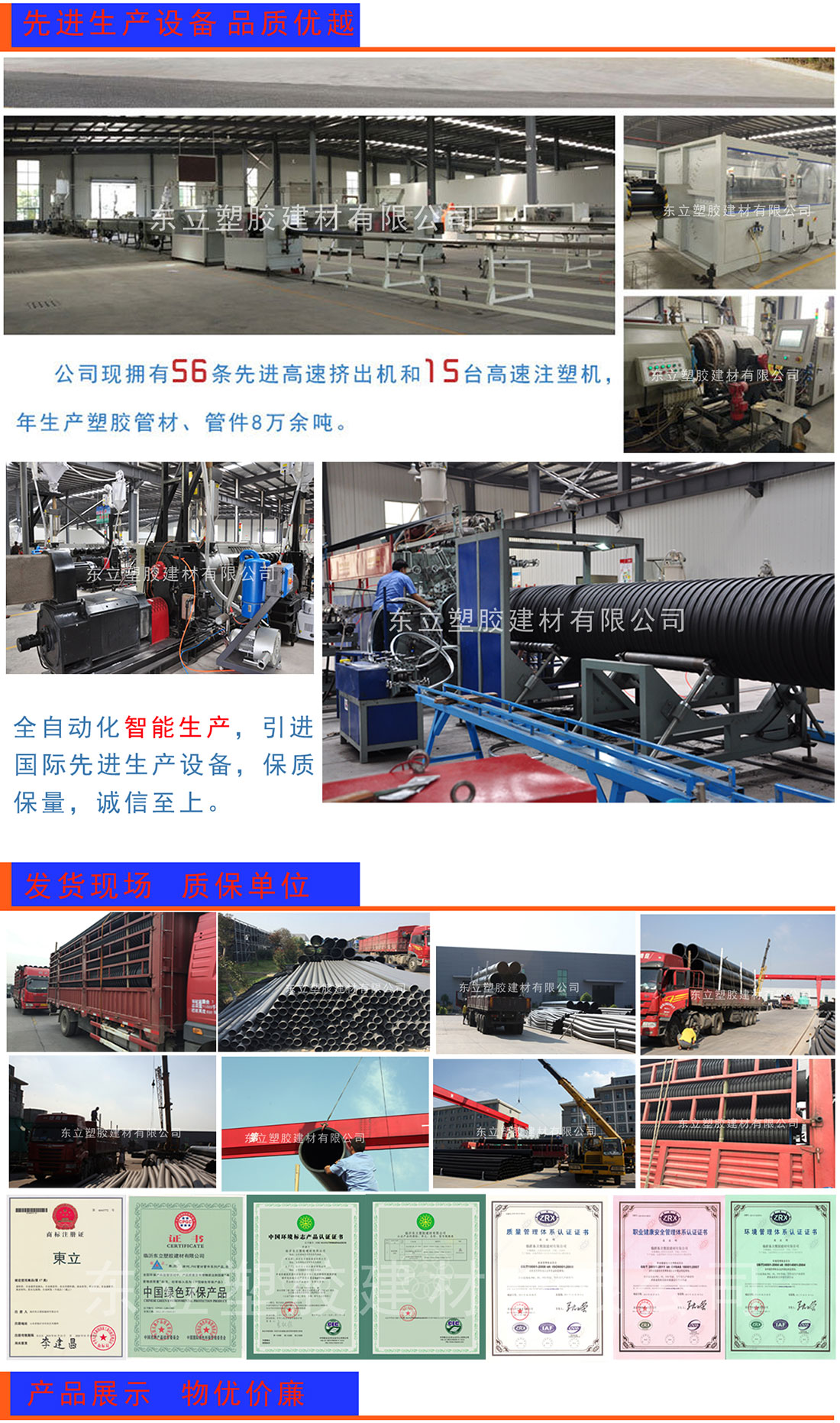 ??主要生產(chǎn)“東立”品牌塑膠管道,主要產(chǎn)品包括五大系列十六種產(chǎn)品,規(guī)格齊全,產(chǎn)能龐大、供貨及時(shí),設(shè)備先進(jìn)、質(zhì)量穩(wěn)定,服務(wù)優(yōu)良、滿足客戶的需求。