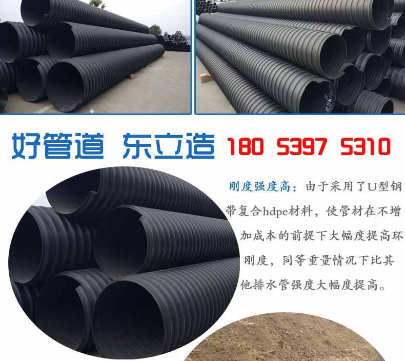 2.大口徑高強度:由于采用了U型鋼帶復合PE材料,使管材在不增加成本的前提下大幅度提高環(huán)剛度,同等重量情況下比其他塑料排水管強度大幅度提高。可解決重載等一系列問題,大口徑管材優(yōu)勢更加明顯,比水泥管和其它塑料管重量更輕、強度更高。